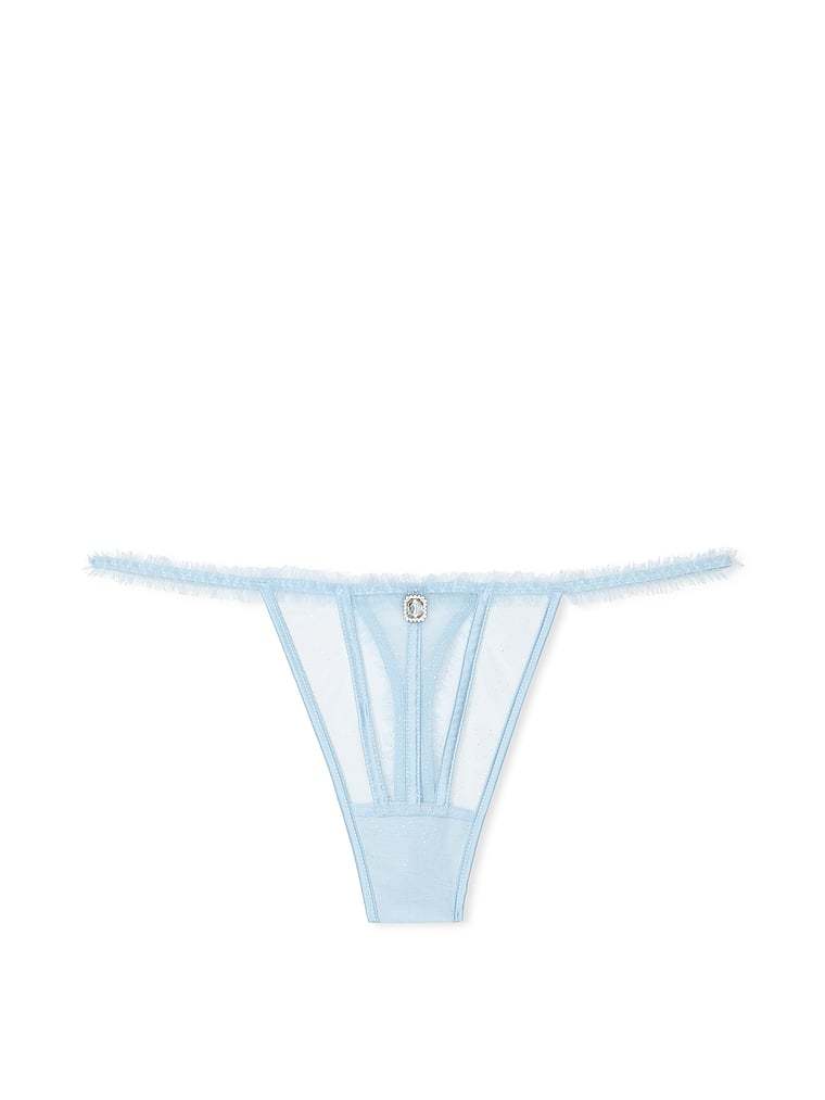 Sparked with subtle metallic touches and traced in satin, this sheer tulle Thong is complete with a gleaming rhinestone charm.